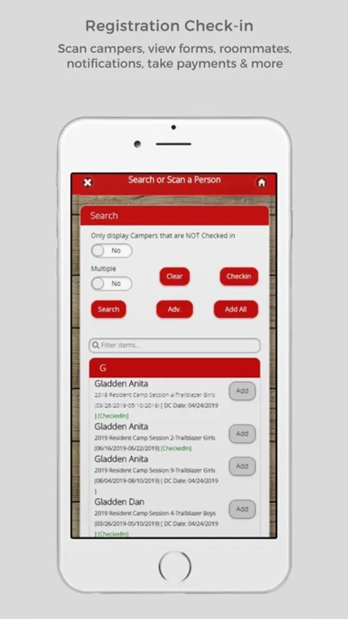 Allows camps to check-in campers while making sure payment has been received, forms are complete, as well as taking payments for registration fees & camp store funds.