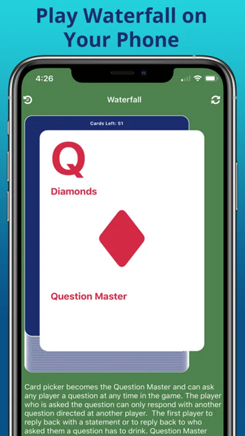 Play the game my friends love called Waterfall. It's a drinking game played with a deck of cards. This app includes everything you need to play: the rules and a deck of cards. (Well everything except your drink of choice.)