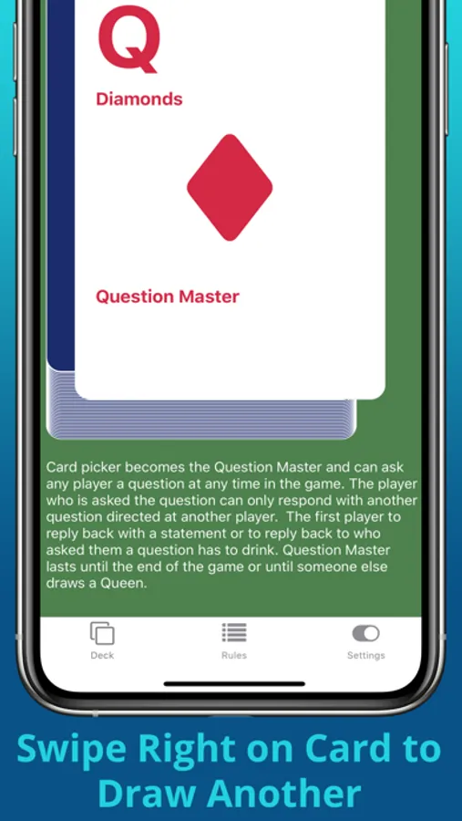Everyone sits around a deck of cards. One player selects the top card on the deck and flips it over. The card decides what happens next.