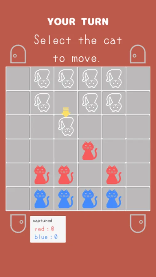 On your turn, you must move exactly one of your cats 1 space forward/backward/sideways (never diagonally!).