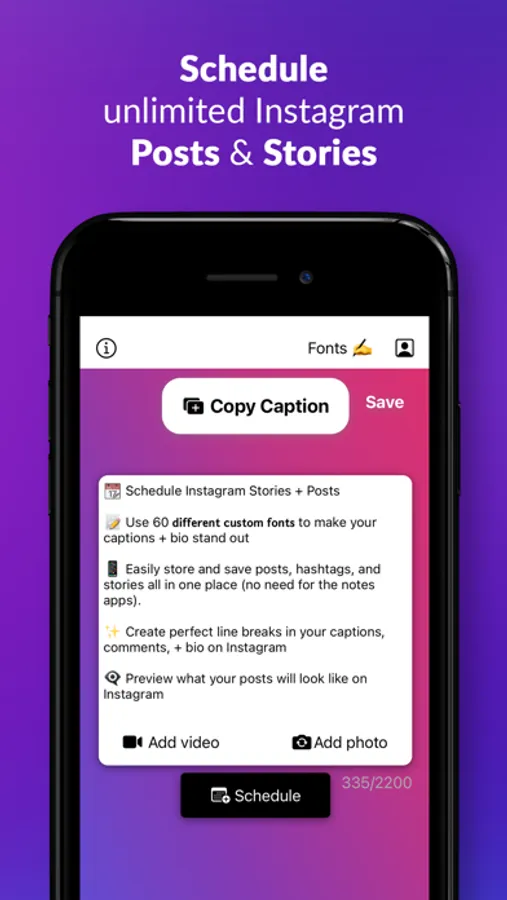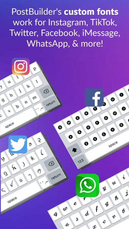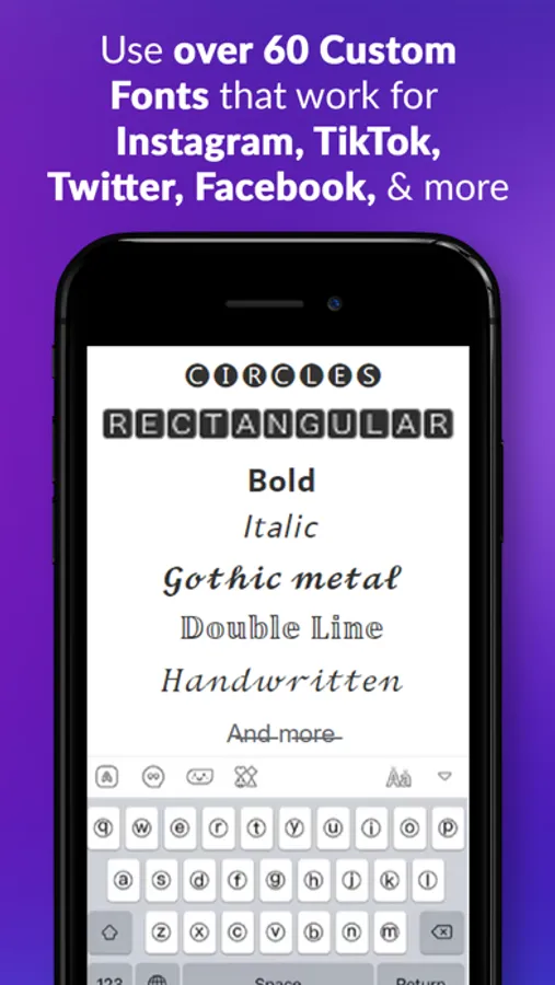 ● Use over 60 custom fonts that work across Instagram, TikTok, iMessage, Twitter, LinkedIn, Facebook, and more