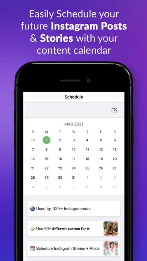 Schedule unlimited future Instagram stories and posts in your PostBuilder content calendar.