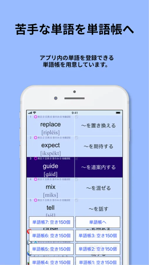 アプリ内の練習とテストを繰り返し、ユーザーが自由に振り分けられる単語帳で苦手単語を復習できます。