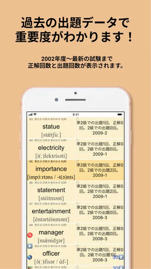 英検の語彙問題は過去問から多く出題され、頻出の単語は繰り返し出題されています。アプリ内の各品詞のステージ1範囲には正解として出題された単語と選択肢としての出題回数が多い単語をまとめています。優先的にステージ1範囲を学習することで効率よく合格点へ近づくことができます。
