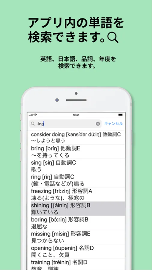 検索ページでは単語や意味、発音記号から検索することができます。検索した単語から品詞別リストへ移動できます。