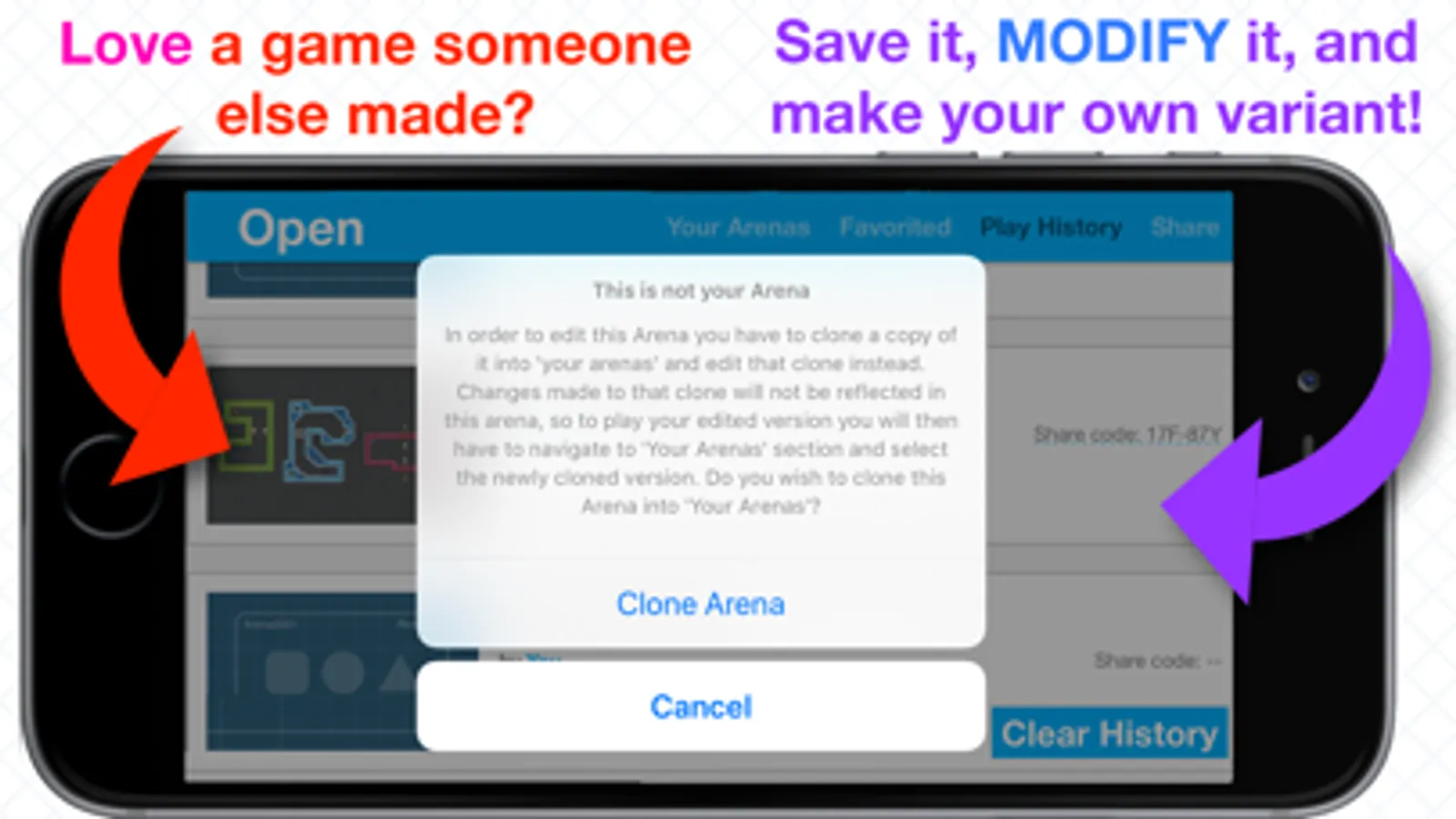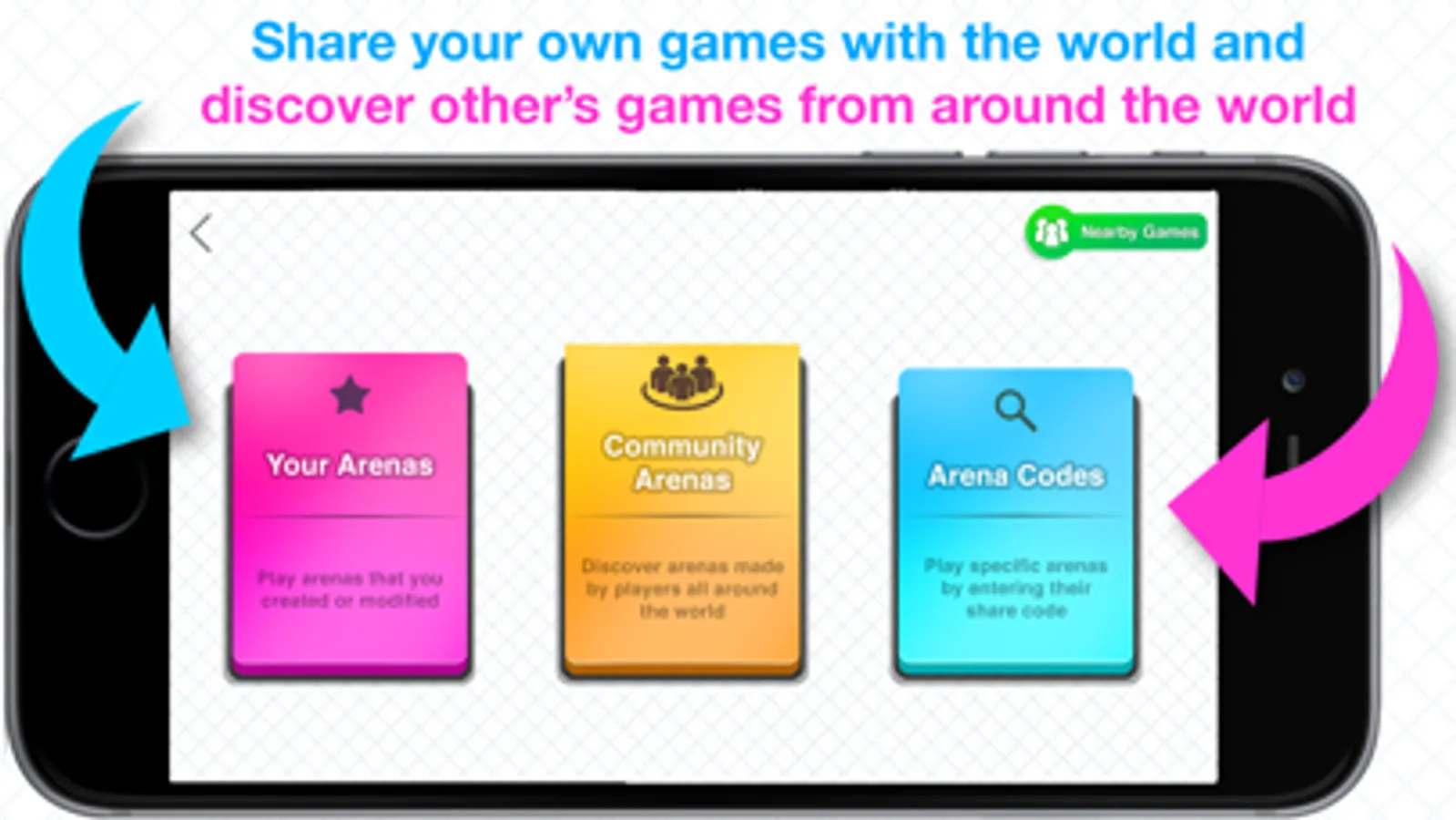 You can create single-player or multi-player games and play them with your friends (via bluetooth) or publish them to the community so others can enjoy. Explore "Community Arenas" to find fun games all around the world! If you find a game you really like, feel free to save a copy, open it in the editor, and modify it however you like to make your own variant.