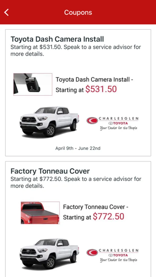 Charlesglen Toyota dealership loyalty app provides customers with an enhanced user experience. The mobile dealership app provide customers with relevant specials and loyalty offers. Key features include:
