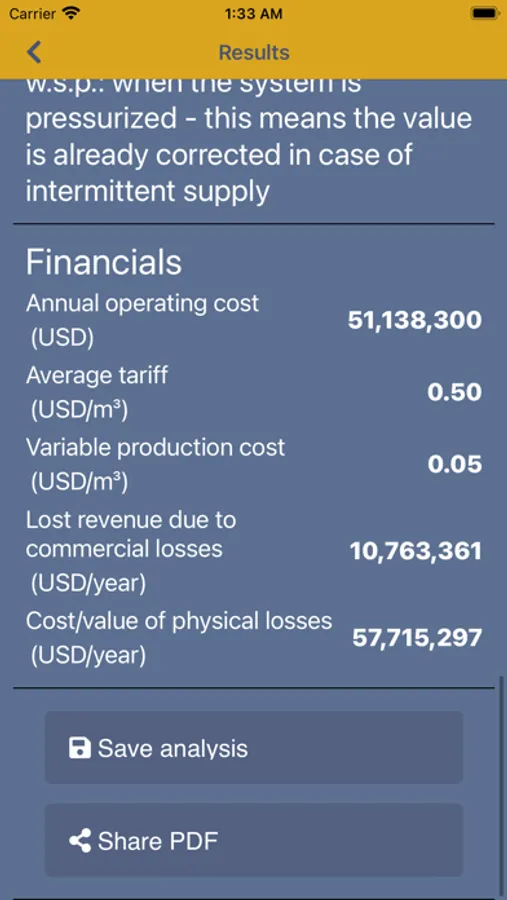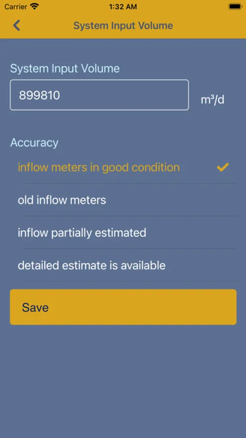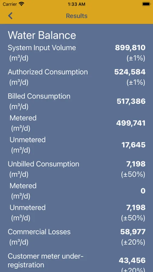 The app EasyCalc mobile intends to bridge the gap between “no idea about the NRW situation" and a detailed water audit using WB-EasyCalc. The app will be most useful for example in initial discussions with a water utility manager when only most basic data are readily available and the app’s default values can be used to fill the blanks. Rough estimates of potential 95% confidence intervals (+/- error margins) are integrated so that potential error range of the results can be easily understood.