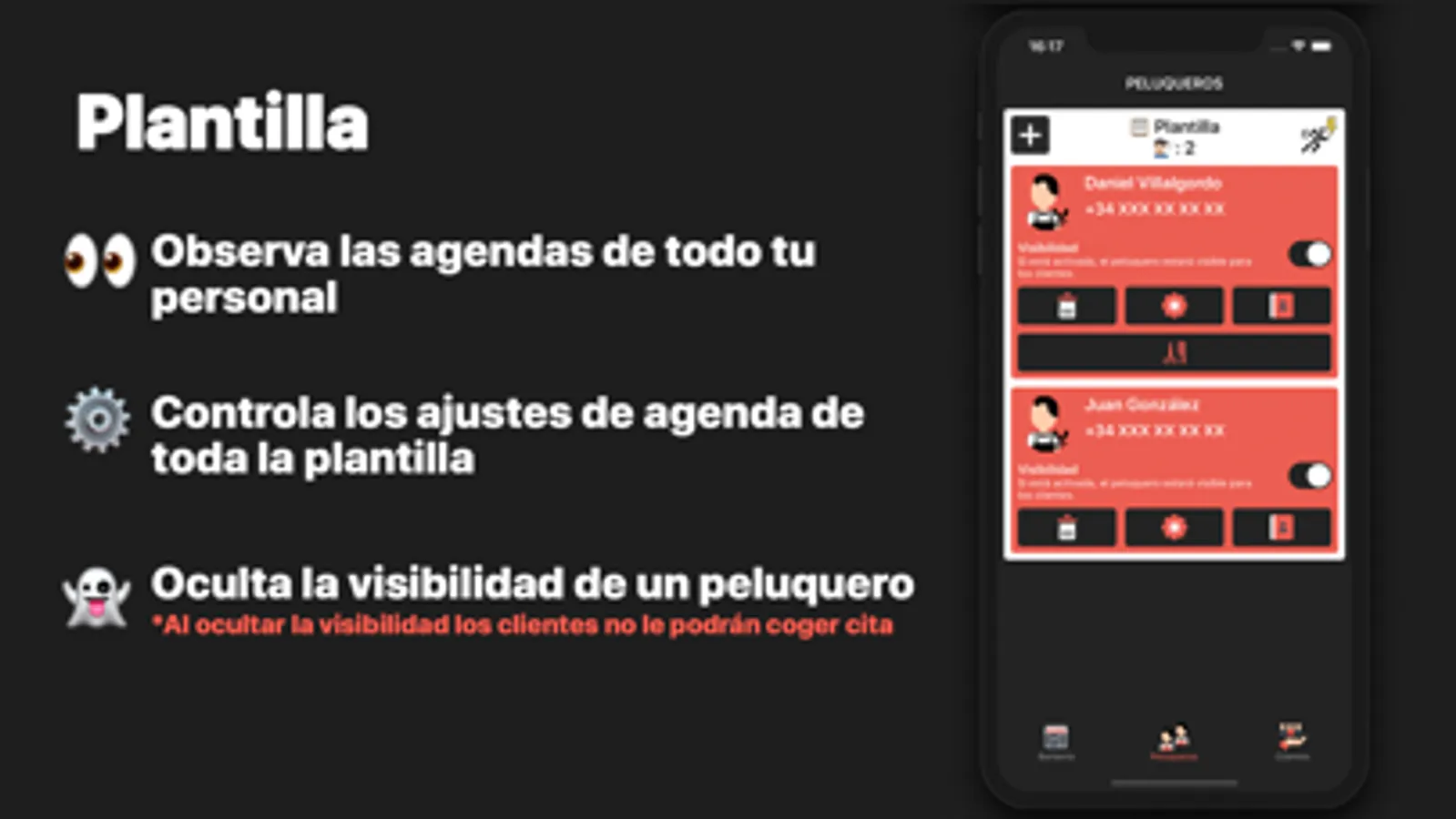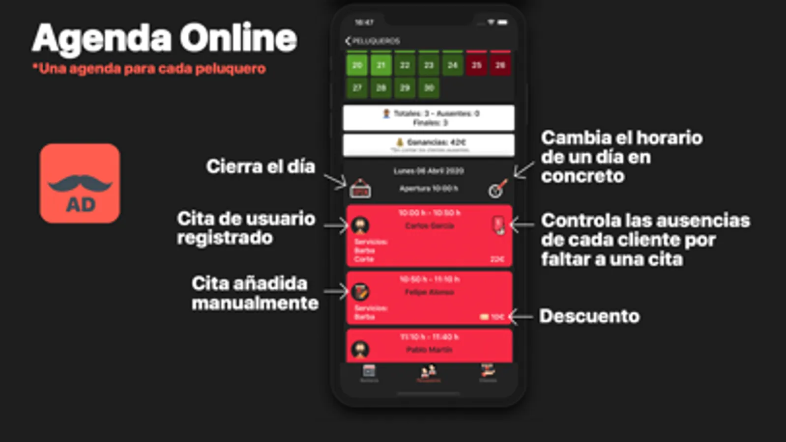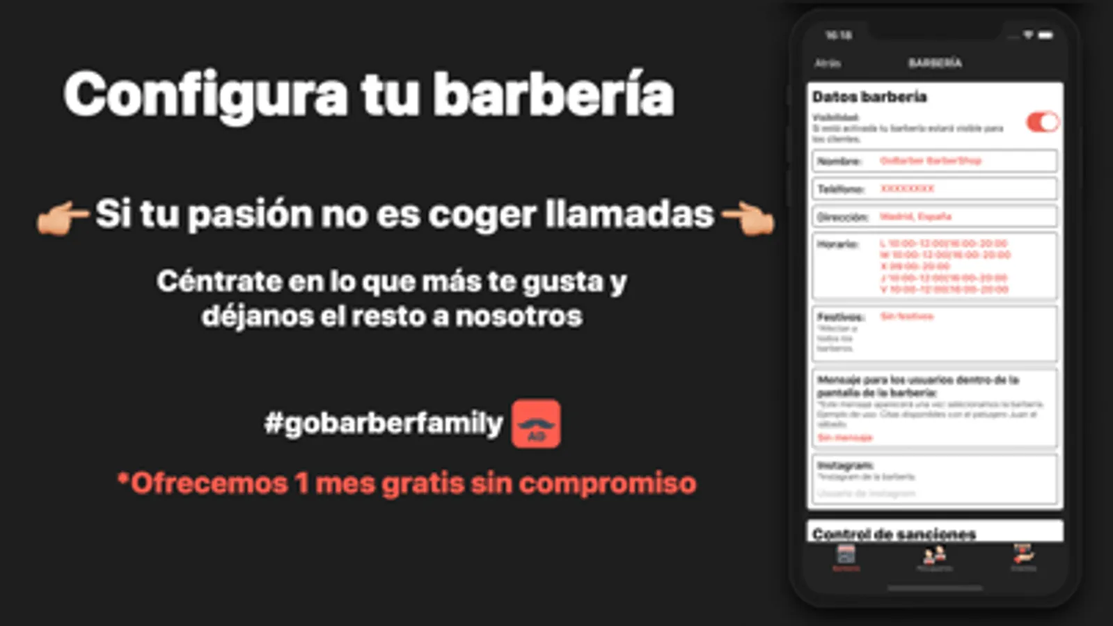 - La posibilidad de cerrar la agenda o cambiar el horario de trabajo de la barbería en determinados días mediante la app, con la posibilidad de enviar notificaciones directamente a tus clientes.