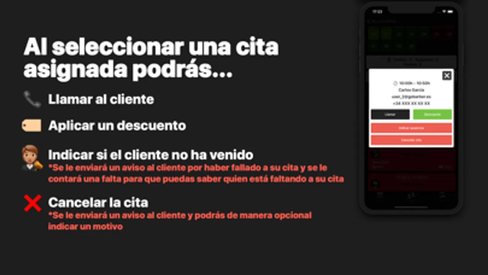 ¡Di adiós a las llamadas! GoBarber facilita la gestión de las necesidades del día a día de tu barbería desde tu dispositivo móvil. Reservar una cita, aplicar un descuento o enviar mensajes masivos a tus clientes sin una llamada telefónica y en solo unos pocos clics.