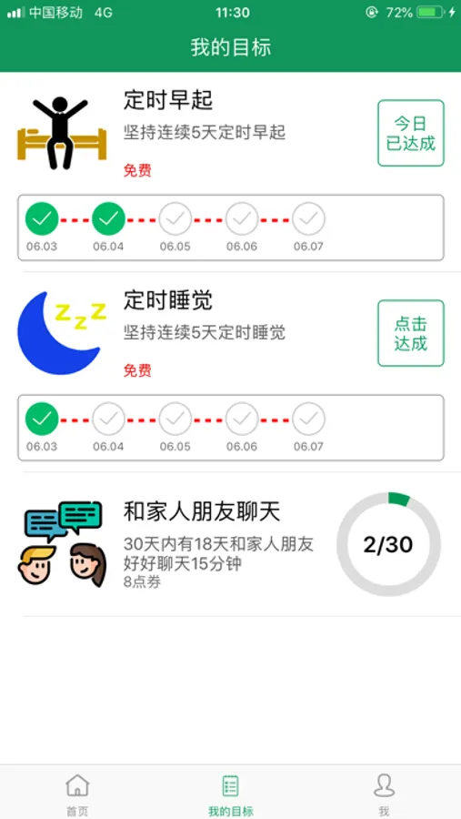 特色功能:完成每一天的目标,获得的积分,可以兑换点券哦~循环利用,绿色发展。