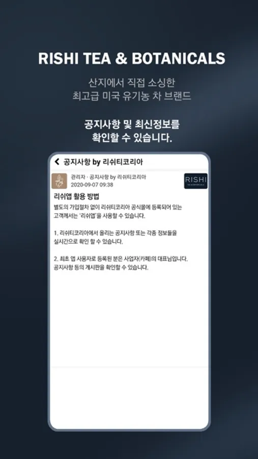 따라서, 고객(사용자)은 리쉬티의 회원사로 사전등록(사업자회원가입)이 된 후에 어플을 [애플스토어]에서 다운받아 사용하실 수 있으며, 설치 후, 바로 공지사항 등을 확인할 수 있습니다..