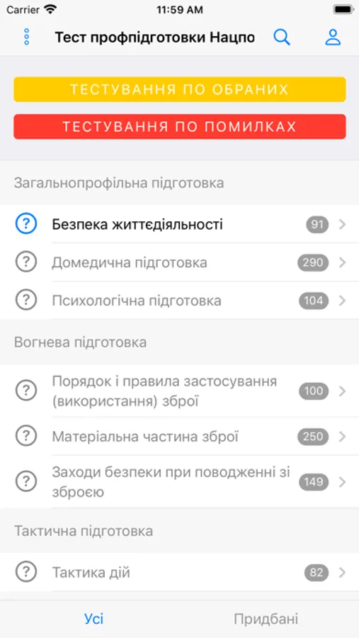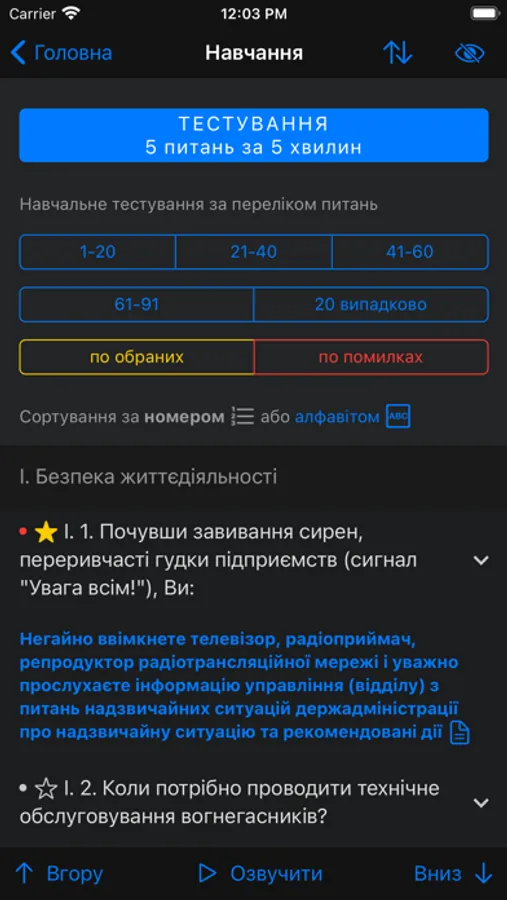 **Навчальний режим включає можливість проходження всіх питань потрібного розділу по порядку чи випадково, або всіх питань потрібної теми відповідного розділу.