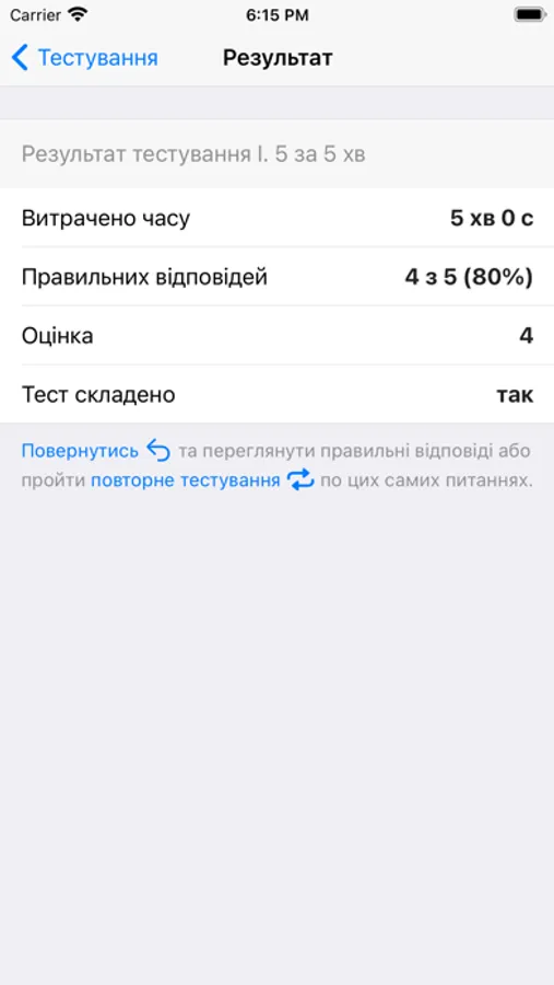 - Робота над помилками (тестування з питань, в яких були допущені помилки);