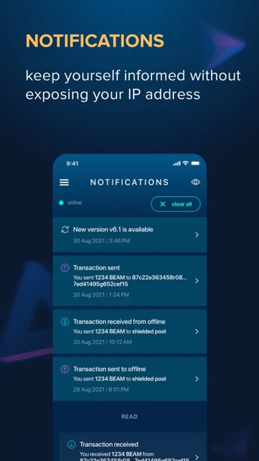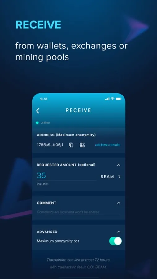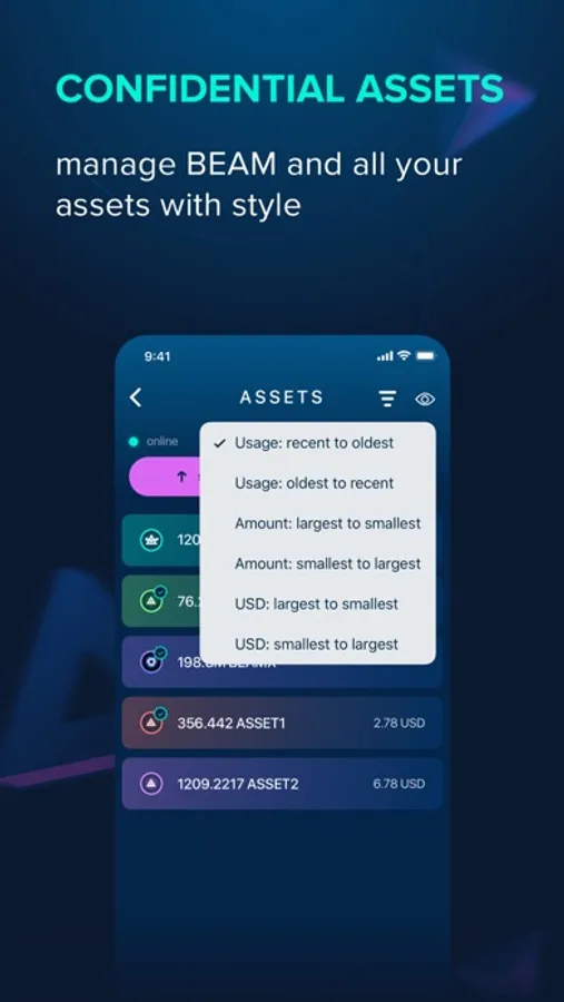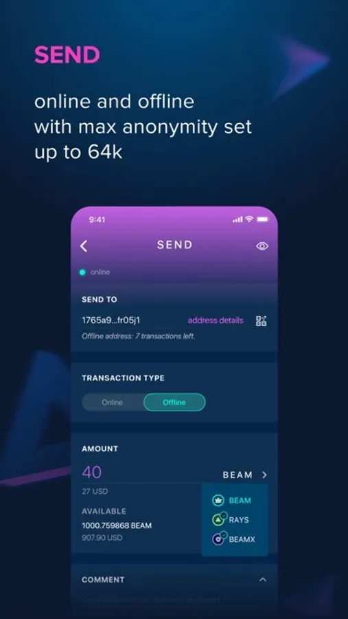 This is the official version of the Beam Mobile Wallet. The wallet allows you to conveniently manage and transact your BEAMs and Confidential Assets using alphanumeric addresses or QR codes in an easy, safe and secure manner.