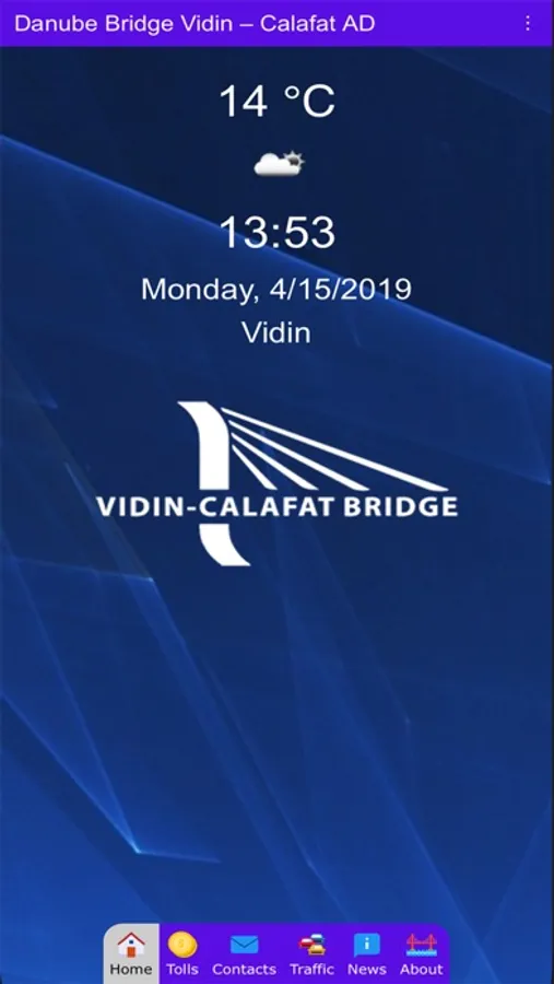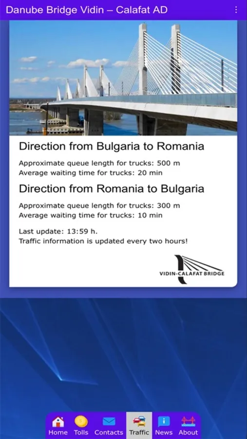 Welcome to the mobile application of "Danube bridge Vidin-Calafat" AD. Here you can find information about the bridge tolls, updated information about the traffic on the Danube bridge Vidin-Calafat and announcements about forthcoming events that may influence the traffic on the bridge.