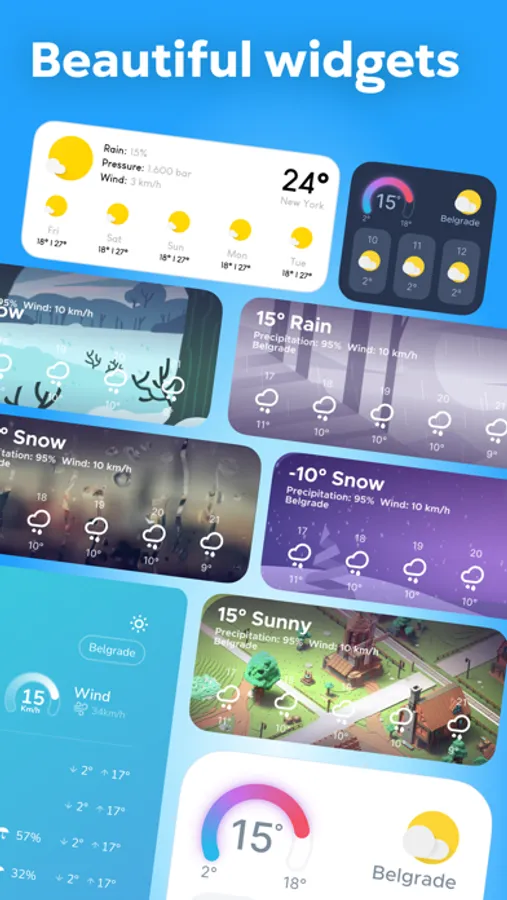 Check the weather right from your Home Screen with Overdrop’s information-rich widgets. Pick from various styles and sizes – whether you need the forecast for the next three hours or the next five days.
