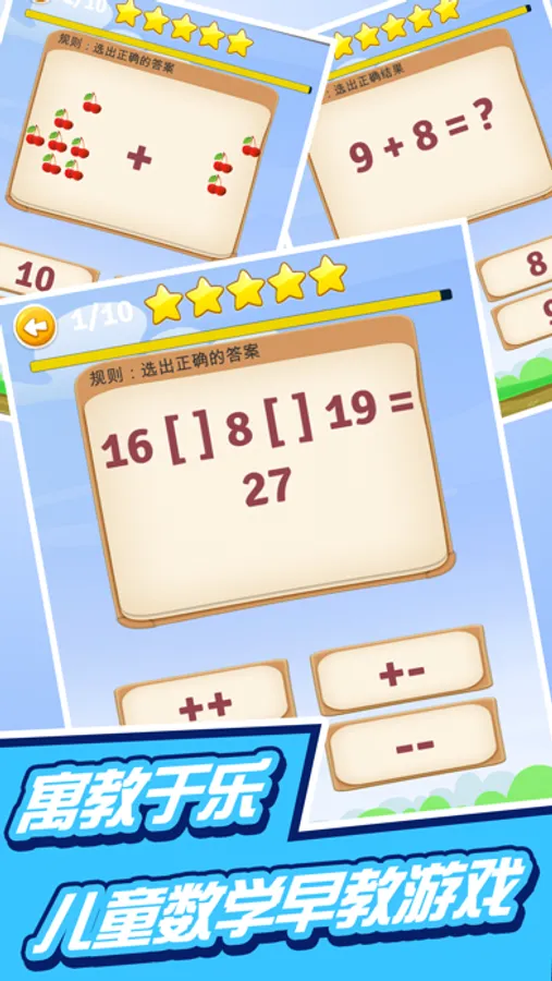 This APP has 13 interesting mathematical methods, including common addition, subtraction, multiplication, division, interesting picture counting, moving number counting, flickering number counting, color number counting, flashing number counting, maximum and minimum counting, group counting, equation counting, etc.