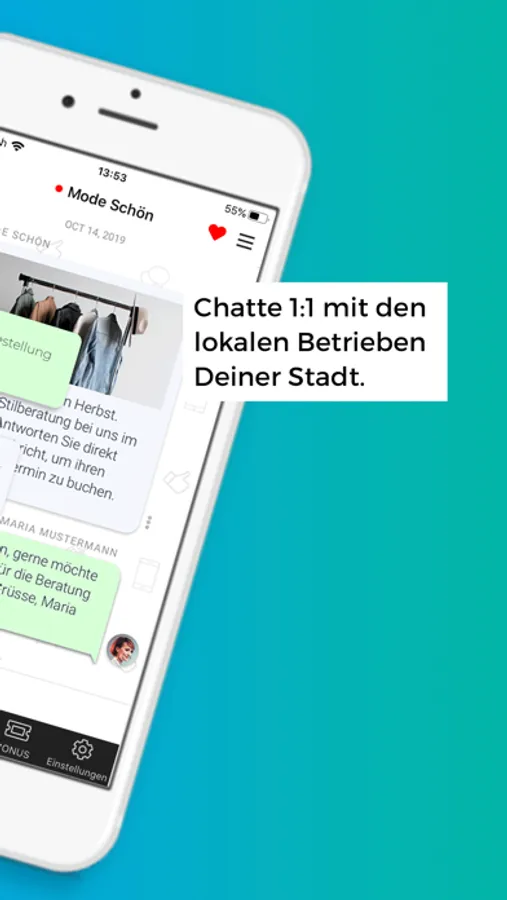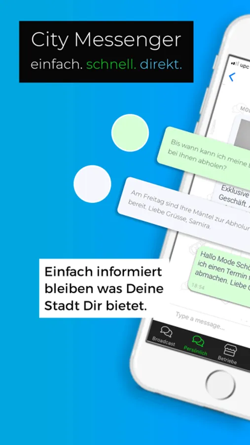 Einfach, schnell und direkt Kontakt mit den teilnehmenden Betrieben, Organisationen und der Stadt aufnehmen. Direkt auf Broadcast-Nachrichten antworten oder eine persönliche Kommunikation mit einem Betrieb starten und von einer zeitungebundenen Kontaktaufnahme profitieren: Anliegen können unabhängig von Öffnungszeiten oder telefonischen Verfügbarkeiten kommuniziert werden.