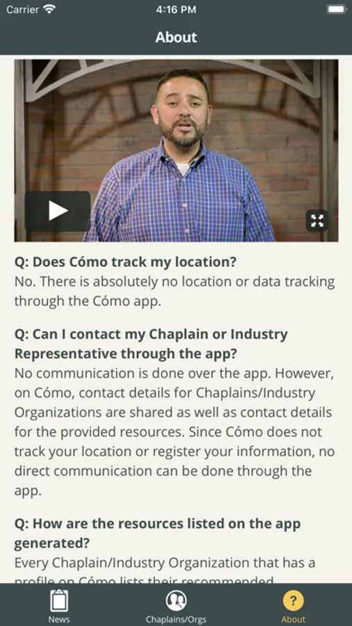 Cómo does not recognize or track your location. The app serves only to directly connect you to your trusted chaplain or organization and their recommended resources. Each profile on Cómo is controlled and updated by approved chaplains and organizations. As the app does not recognize or track your location, you can easily change your chaplain or organization with a simple touch wherever you go!