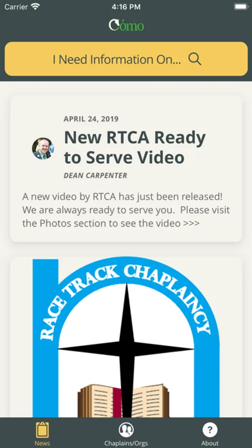 Cómo is the app to connect you to a variety of vital services you need through a network of racetrack chaplains and industry organizations. You can follow their profiles on Cómo where they have shared their approved list of services available, including healthcare, legal, continuing education and many others. They will also share current informational alerts and messages as well as daily devotionals. If you need a nearby doctor, an ESL class, an addiction recovery resource, or just some daily inspiration, Cómo is here to connect you.