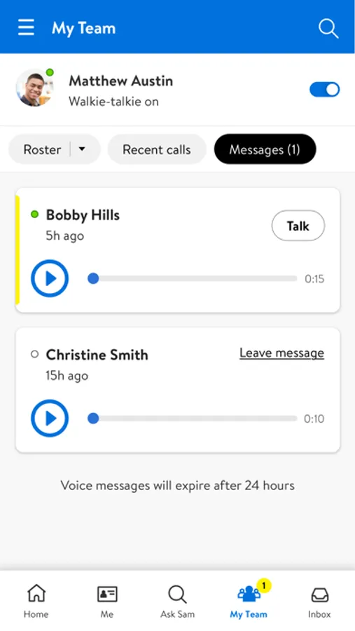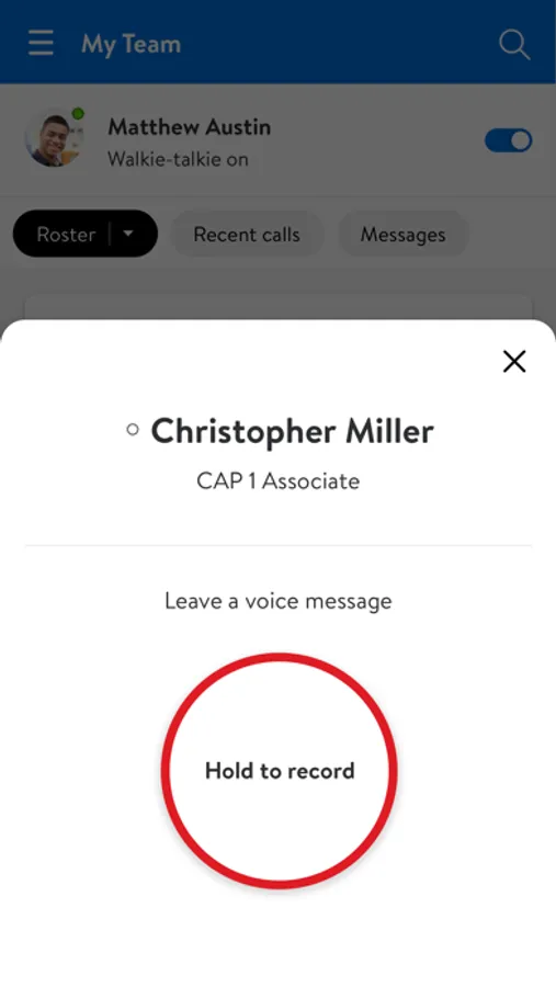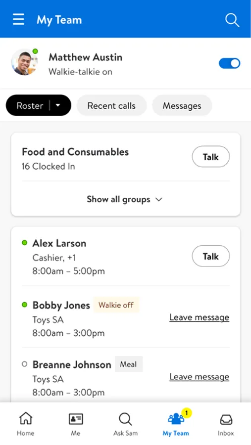 My Team: A roster view of who is working with an in-app walkie-talkie feature to stay connected to other associates and your team
