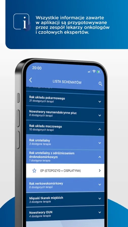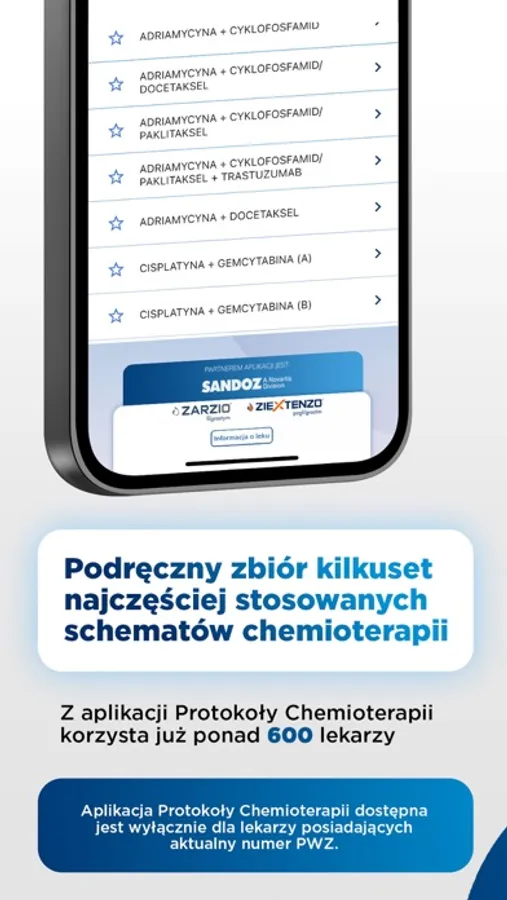 Aplikacja „Protokoły Chemioterapii” uwzględnia kilkaset najczęściej stosowanych w onkologii schematów chemioterapii, z uwzględnieniem podziału w zależności od typu nowotworu (rak trzustki, itp.), z podaniem: zalecanych dawek leków w przeliczeniu na m2, długości trwania podawanych dożylnie leków cytotoksycznych, rodzaju zalecanych rozpuszczalników (zgodnie z charakterystykami produktów leczniczych) oraz częstości podawania cykli.