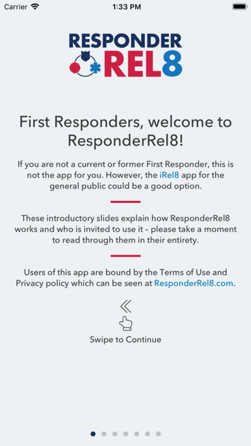 Please note: ResponderRel8 is not monitored for treatment or counseling purposes. Any advice or resources received by peers in this app should not be considered a substitute for formal diagnosis and/or treatment. If you have mental, emotional or physical health issues, please contact a qualified healthcare provider.