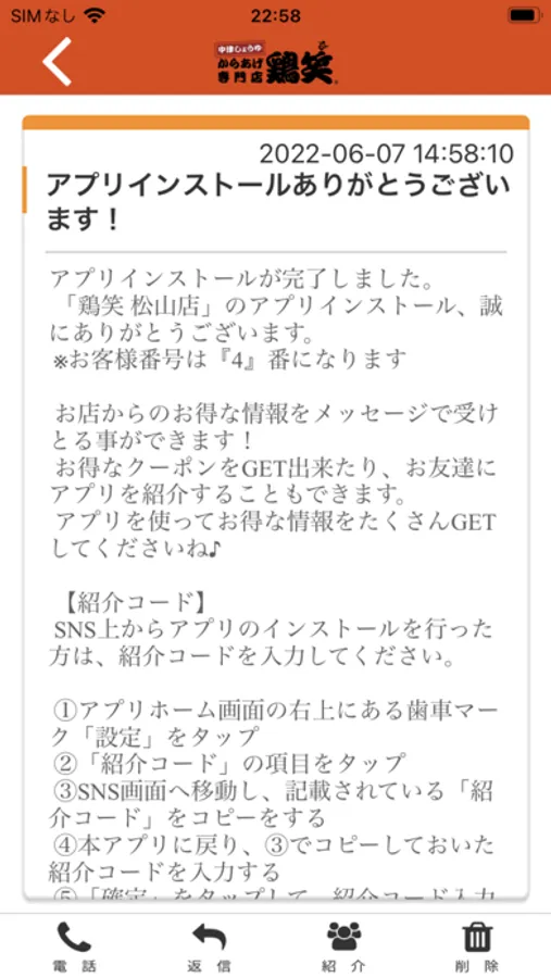 鶏笑 松山店のアプリをSNSを通じてお友達に紹介する事ができます。