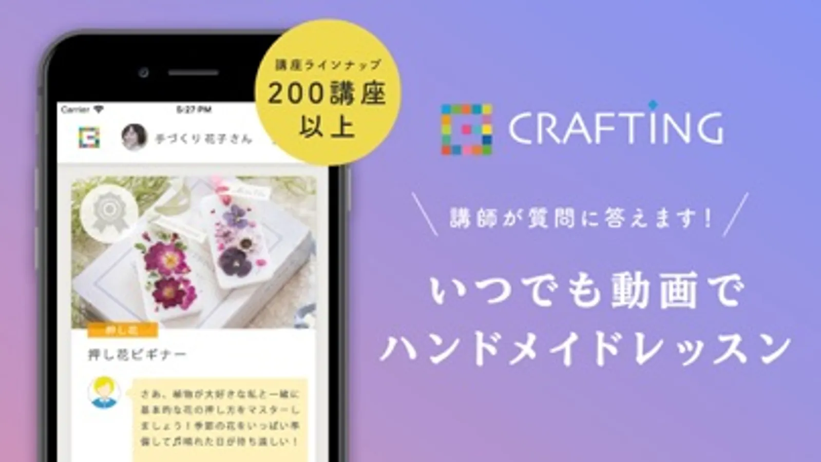 CRAFTINGは、あなたの作りたいをサポートするハンドメイドレッスンのオンラインサービスです。Appで動画を見ながら、ご自宅でゆっくり手づくりを楽しんで頂けます。全8ジャンル100講座以上をラインナップ。今後も毎月新しい講座が続々と開講予定です!