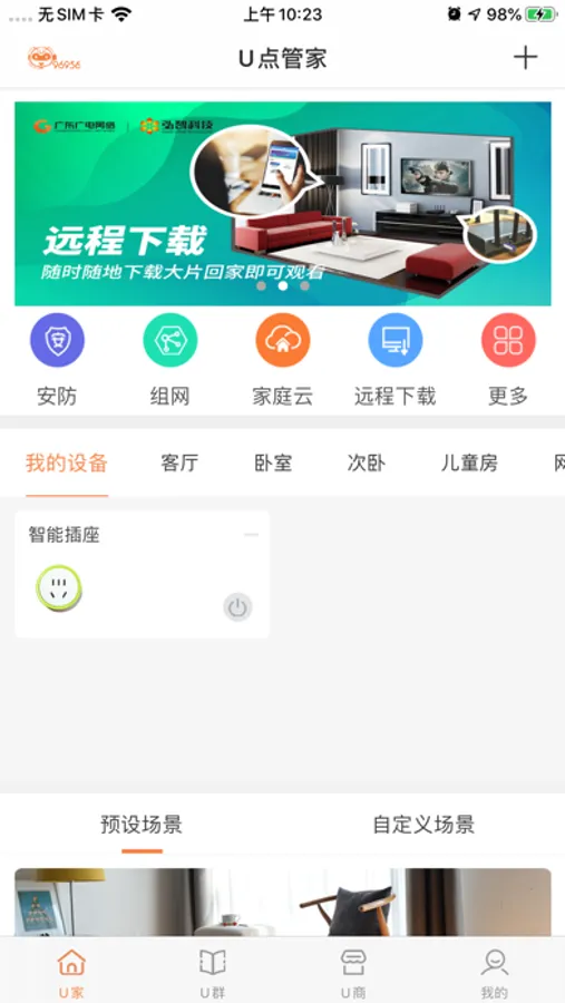 U点管家,是广东广电网络针对智慧家庭业务精心打造的一款应用APP,能够轻松实现家庭智能网关、智能组网、智能家居、家庭云盘、家长控制、应用加速等产品的操控管理,是广东广电新数字家庭业务的移动端统一入口,让您享受高品质的智慧家居生活。U点管家,让家居生活更精彩、更便捷、更安全、更智能!