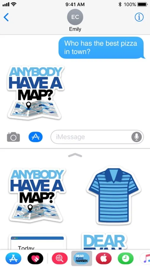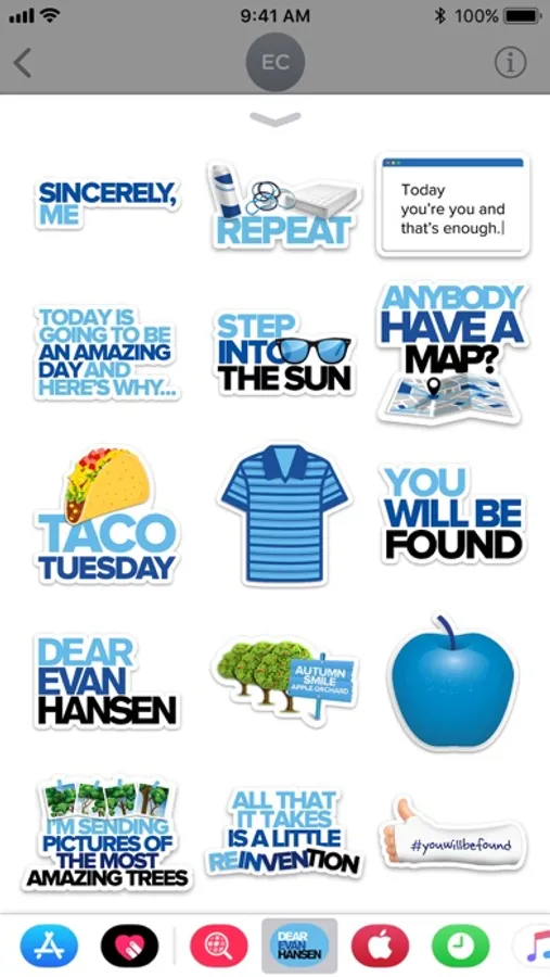 Dear Evan Hansen stickers are now available in the App store. Send your favorite lyrics and moments from the Broadway musical to your friends, family, family friends and more. Add a little blue to your conversations today.