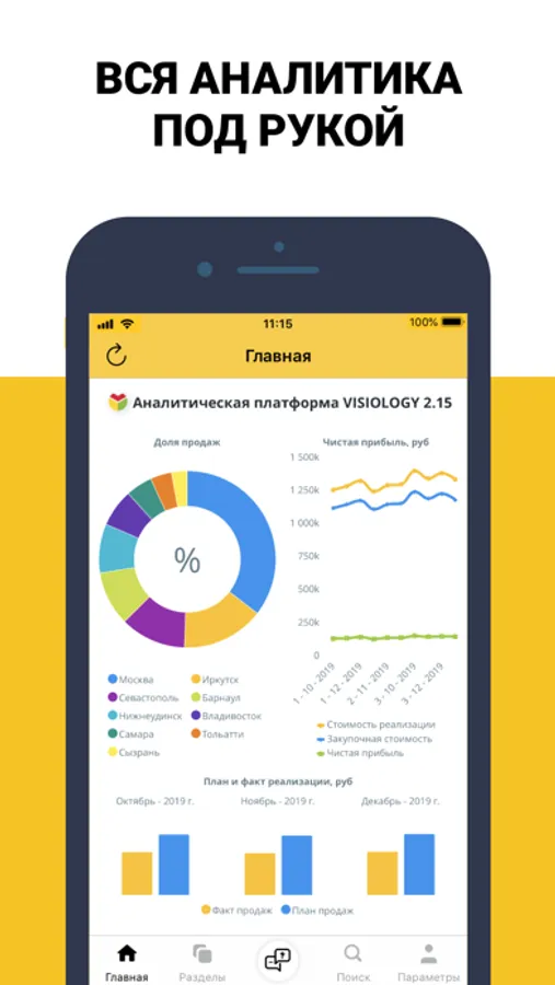 Мобильное приложение Visiology предоставляет возможность получать отчёты о вашем бизнесе, даже когда под рукой нет компьютера. Обращайтесь к ранее созданным аналитическим панелям, используйте фильтры, drill-down и другие возможности платформы Visiology для анализа данных.