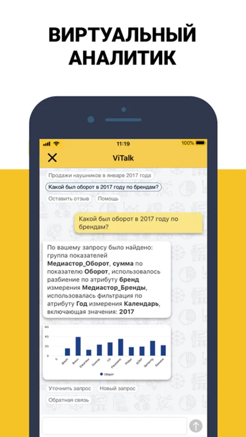 Навигация, оптимизированная под мобильные устройства, позволяет быстрее находить нужный дэшборд. Виртуальный помощник ViTalk отобразит нужный аналитический отчёт по голосовому запросу.