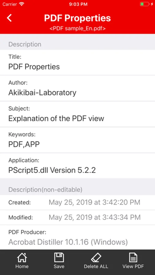 PDF Properties App displays and edits the property information of PDF document. You can check the author name of the PDF document and the file name before PDF conversion. You can also delete property information that you forgot to delete.