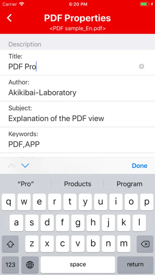 There are five property items that can be edited: "Title", "Author", "Subject", "Keywords", and "Application".