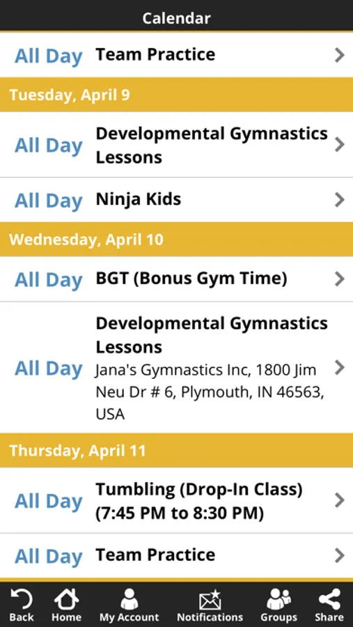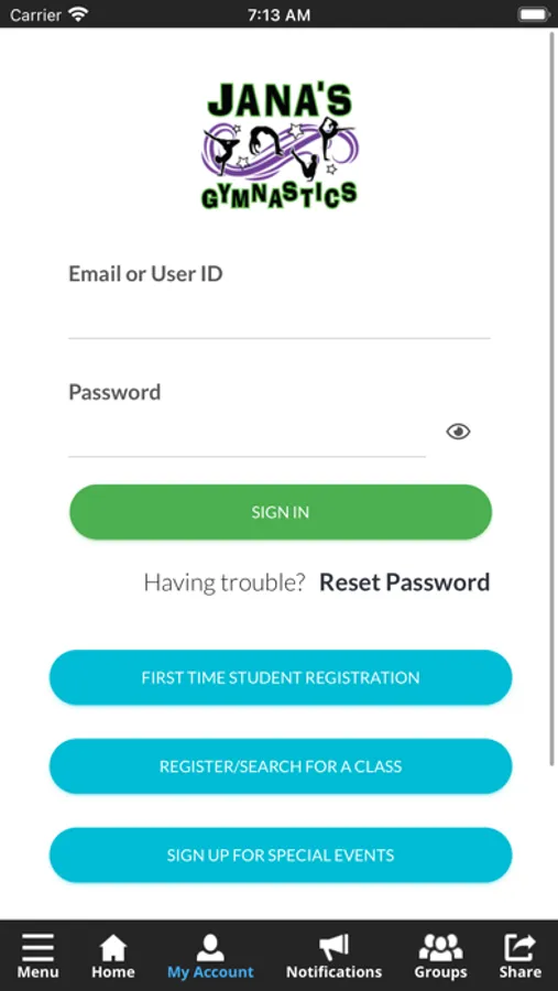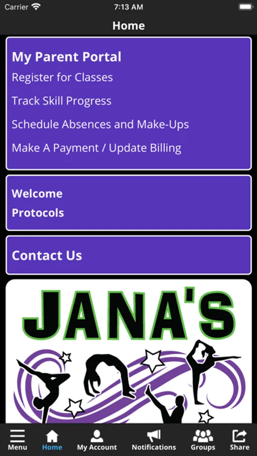 The Jana's Gymnastics app allows you to register for classes, parties and special events. The calendar, team stat tracker, social media links, and contact information are also easily accessible from the app.