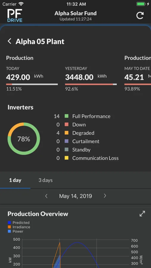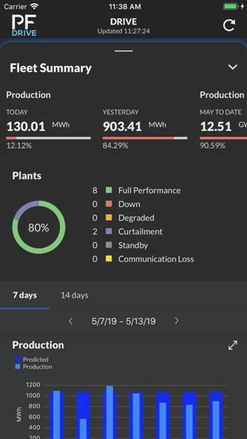 The Power Factors Drive app brings asset performance management to your mobile device. Intuitive screens show KPIs, asset states and generation data across your entire portfolio, delivering essential insights to help you optimize the performance of your wind and solar assets on the go – no laptop required.