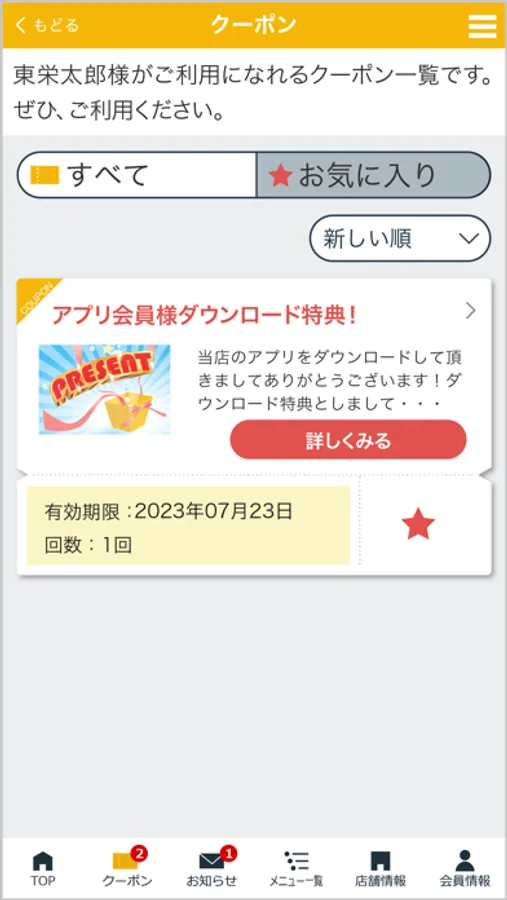 登録した店舗で実施中のキャンペーン情報や各種最新情報をお届けします。