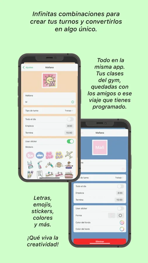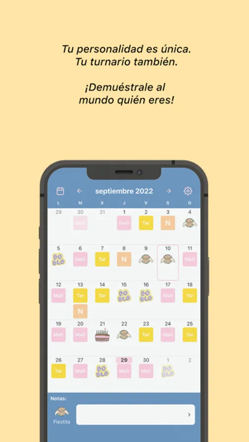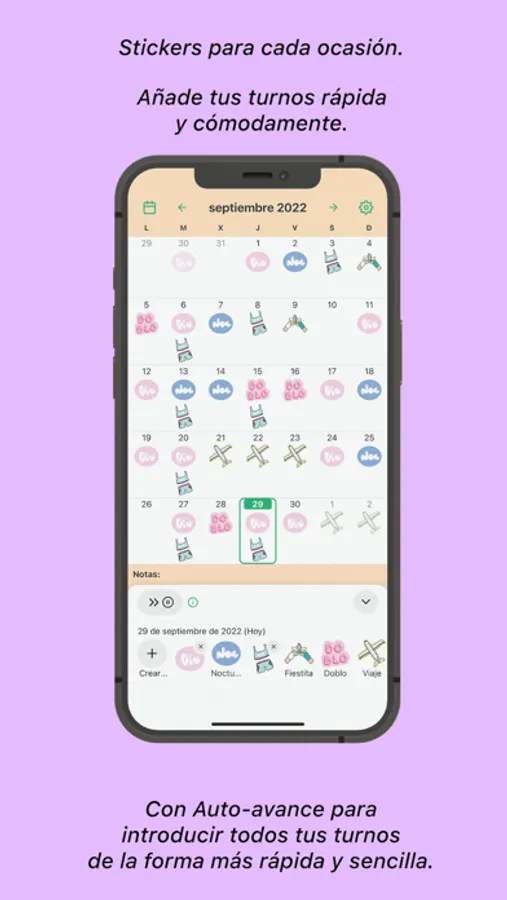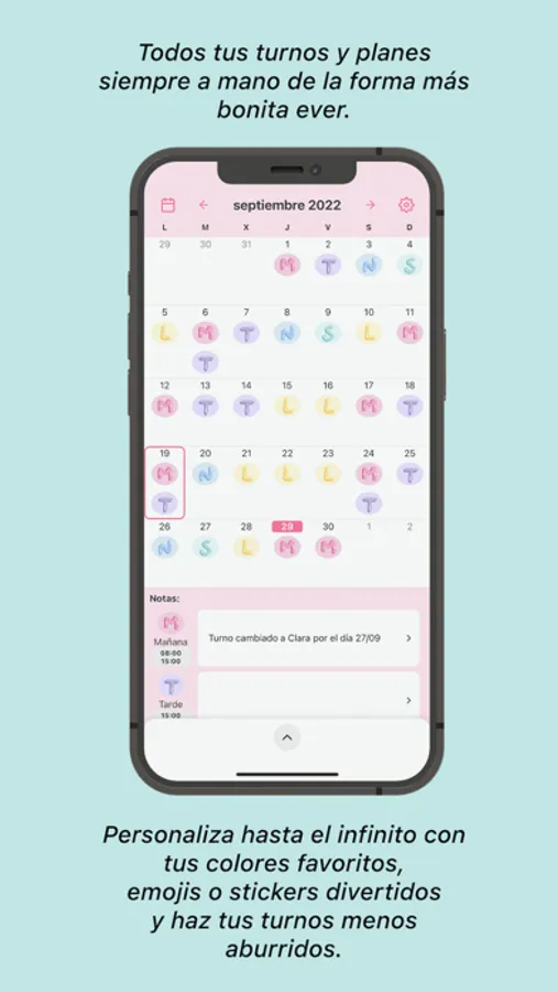 Tus turnos de trabajo de una forma bonita y divertida. Personaliza con colores, formas y stickers.