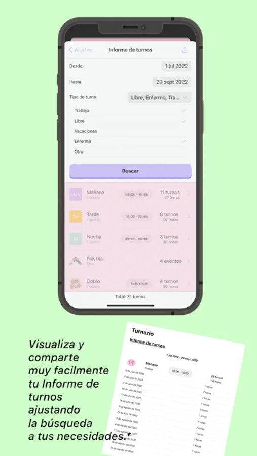 • PERSONALIZACIÓN TOTAL: Modifica tus turnos con diferentes colores, formas y stickers. Cambia los colores de la app para hacerla tuya.