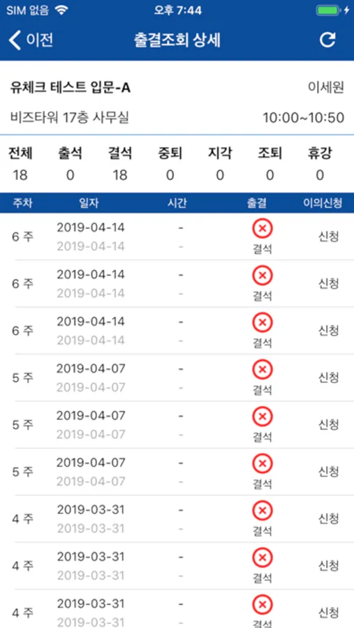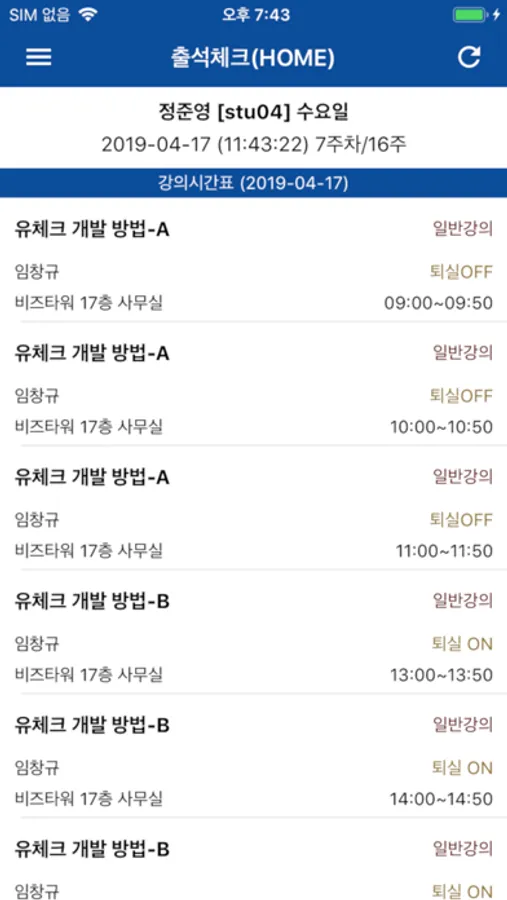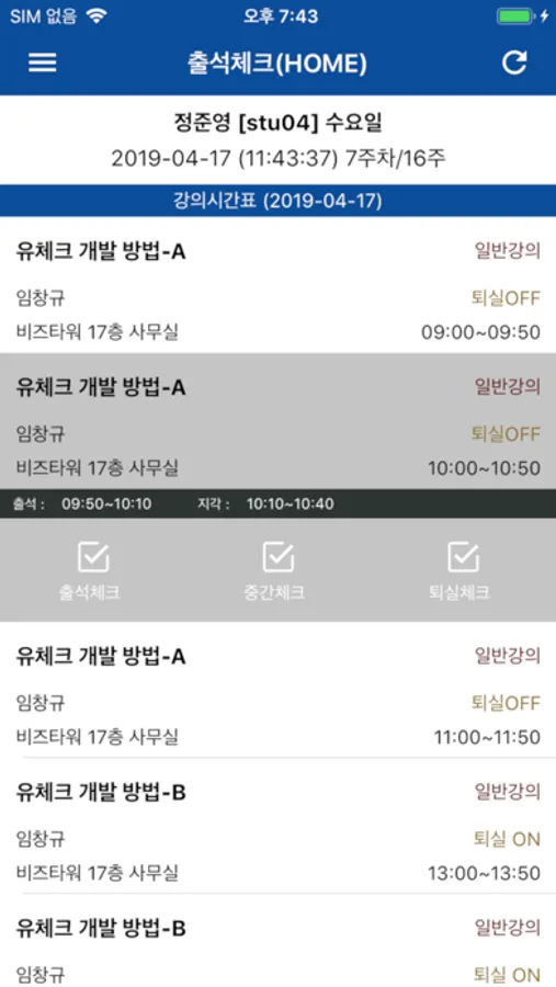 또한 출석체크에 수반되는 출결조회나 이의신청, 공지사항 확인은 물론 푸시 메세지도 제공하고 있습니다.
