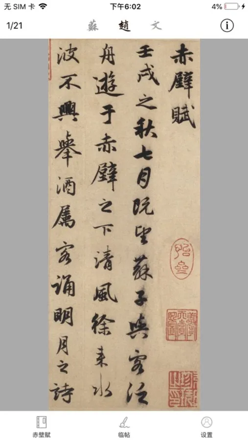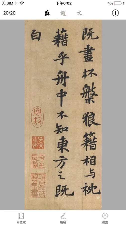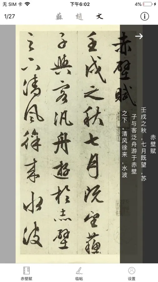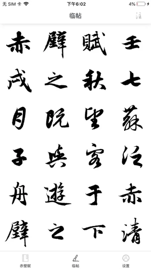 更以赵孟頫书《赤壁赋》为范本,摘取单字,以供临习。以手指移动速度、加速度及压力改变笔道宽度,并可配置。可存所写单字,并可排列成为作品。
