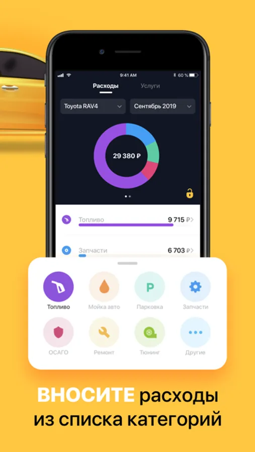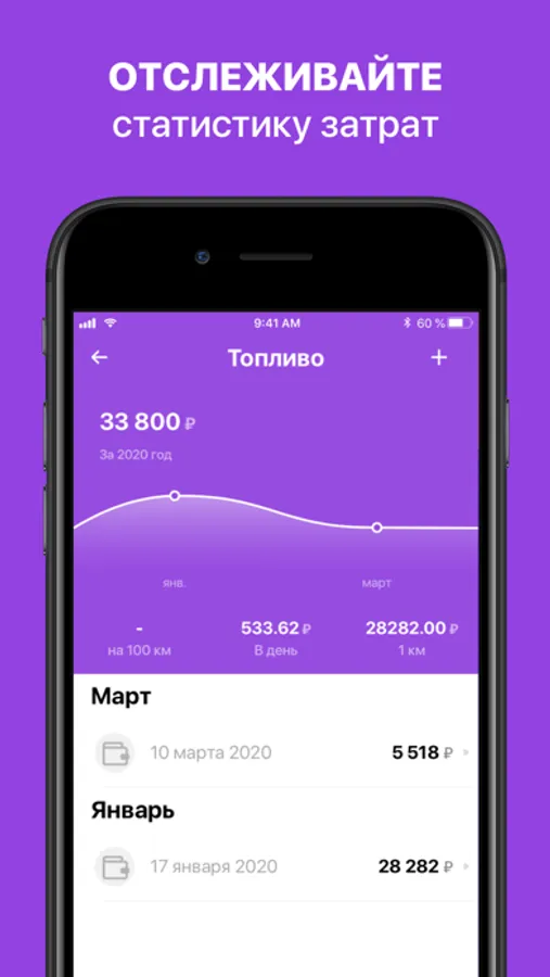 Вносите сумму при каждой заправке, мойке, вносите данные по сумме страхового полиса, технического обслуживания и другие затраты на автомобиль. И в разделе наглядно отслеживайте статистику расходов.