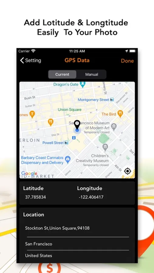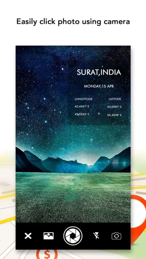 -- If you want to stamp on your gallery picture, then you can add your latitude, longitude, Address, City, Country via Manual GeoTag from Settings.