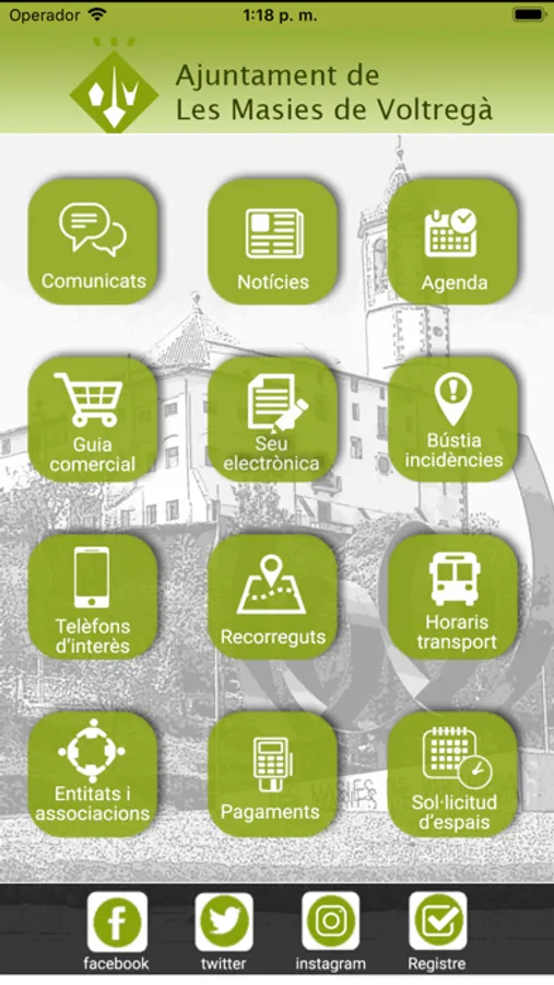 També inclou accés directe a les xarxes socials: facebook, twitter i instagram. Finalment secció registre.