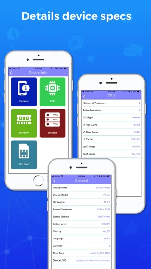• Device Specs: provide other information about SIM card, CPU, RAM, STORAGE, ...