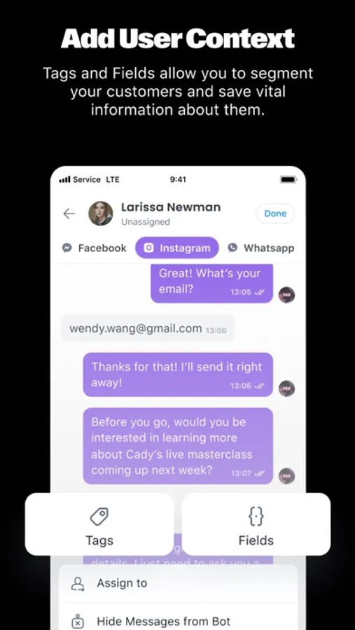 Chat with your subscribers everywhere. Join a conversation and answer questions, manage subscriber data (add Tags, subscribe to Sequences, add Custom Field Values, etc.)