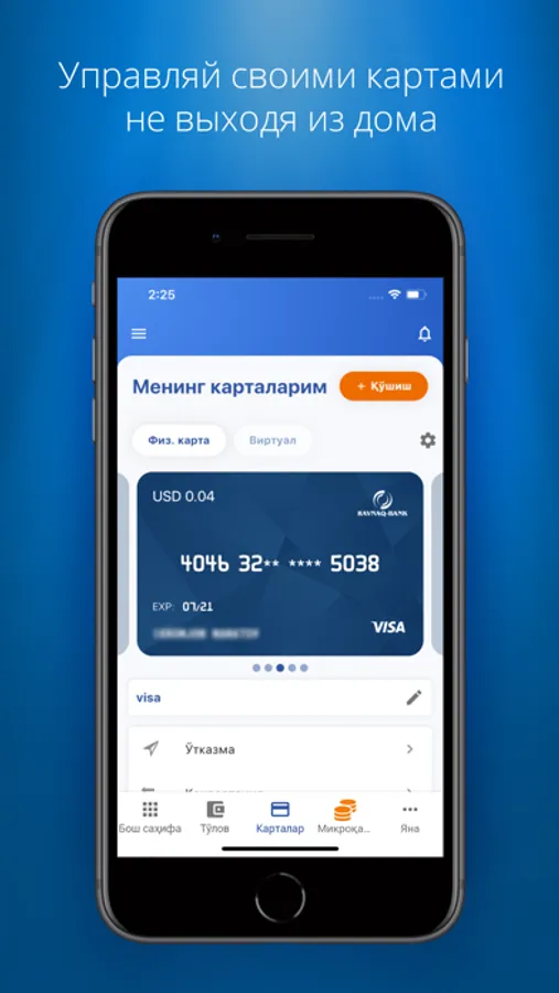 - Переводить деньги между своими картами UZCARD, HUMO, VISA, MasterCard* и на любую другую карту UZCARD или HUMO