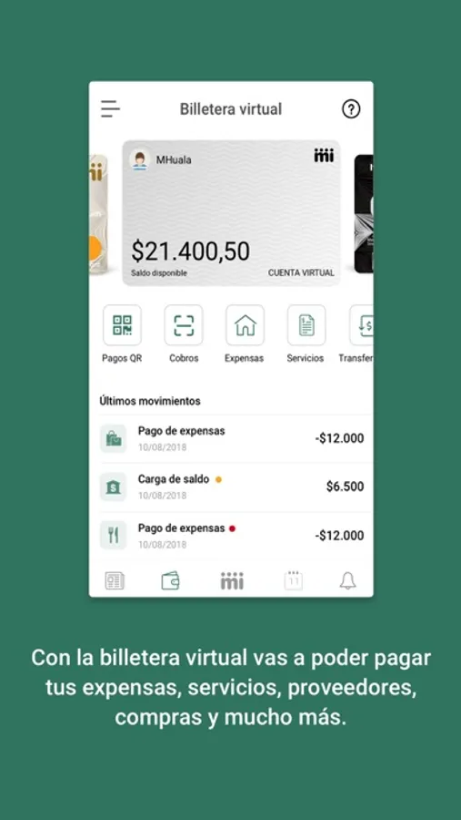 Tiene una billetera virtual desde la que se pueden pagar las expensas por débito directo, comprar con QR en los locales cercanos y envíarle Miiiiers a los más pequeños, para que no anden con efectivo.